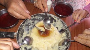 ![]() Mısır unu ile meşhur tereyağımız ile yapılan ortasında yağ göllenen Papa Adlı yemeğimiz | ![]() Pekmez,şeker,mısır unu ile yapılan Hasutamız |